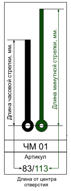Легенда для значений в таблице: Цифровая дробь - длина часовой и минутной стрелок в миллиметрах, отсчитываемая от центра отверстия. Цветные кружки указывают наличие стрелок данного цвета. При необходимости стрелки можно самостоятельно перекрасить.